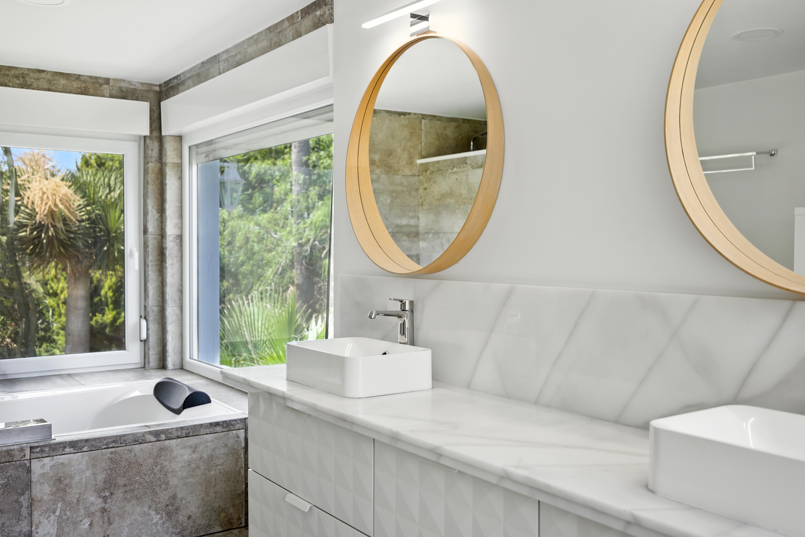 - Stijlvolle badkamers met Roca & Hansgrohe armaturen, marmeren werkbladen en moderne inloopdouches