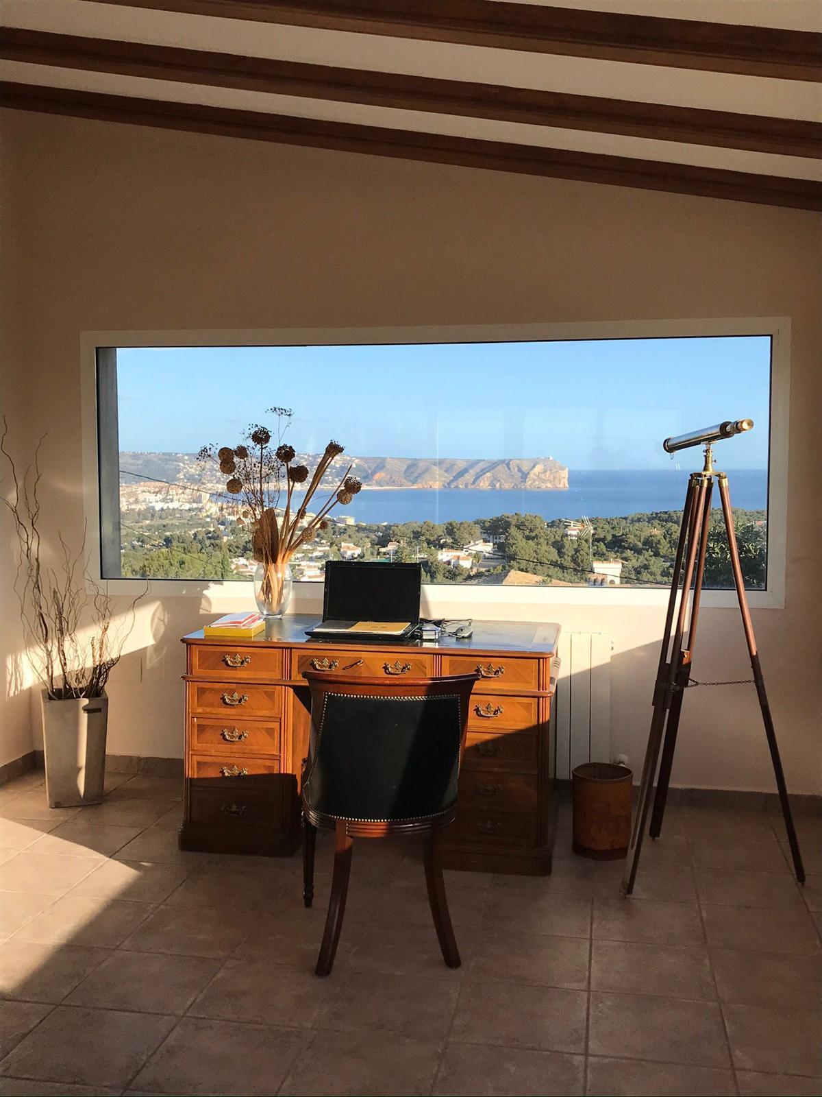 Een panoramisch kantoor met groot raam en uitzicht op zee en Cabo de San Antonio – perfect voor thuiswerken of creatieve inspiratie