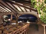 Een indrukwekkende overdekte buiten-eetruimte met natuurstenen bogen en houten balken, geschikt voor meer dan 20 personen