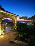 Privézwembad met chill-out zone en Balinees bed, omringd door volwassen mediterrane tuinen
