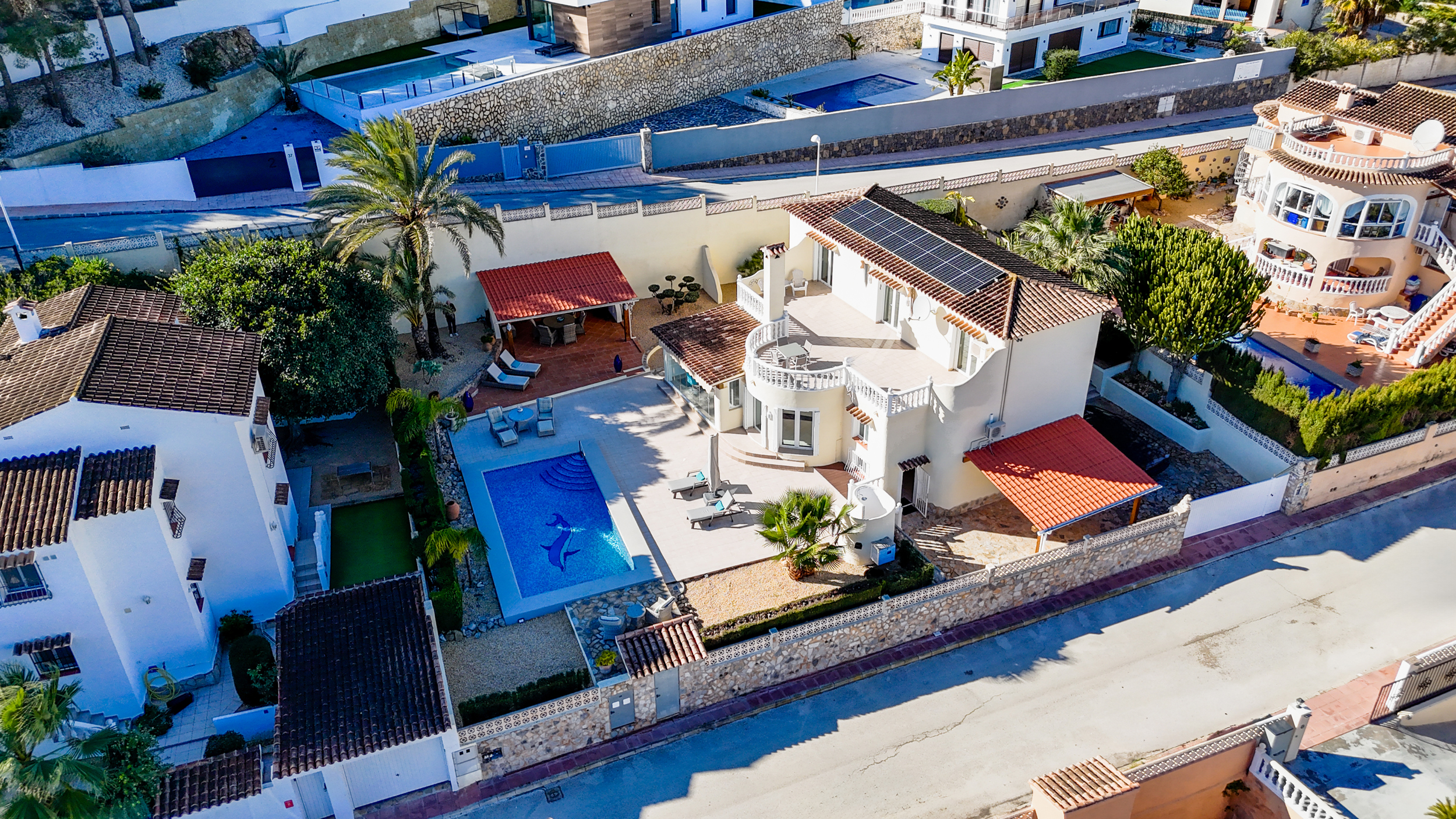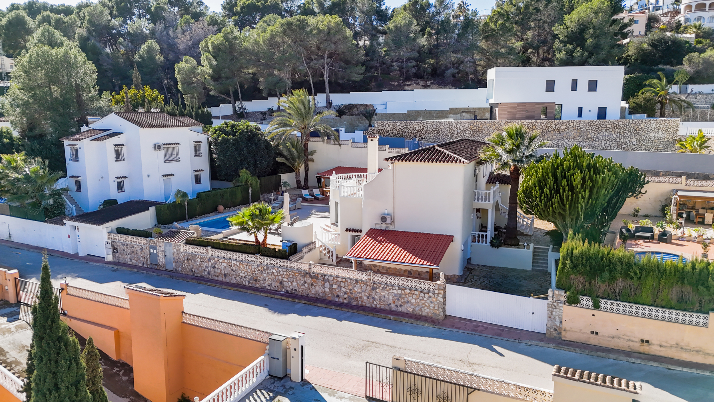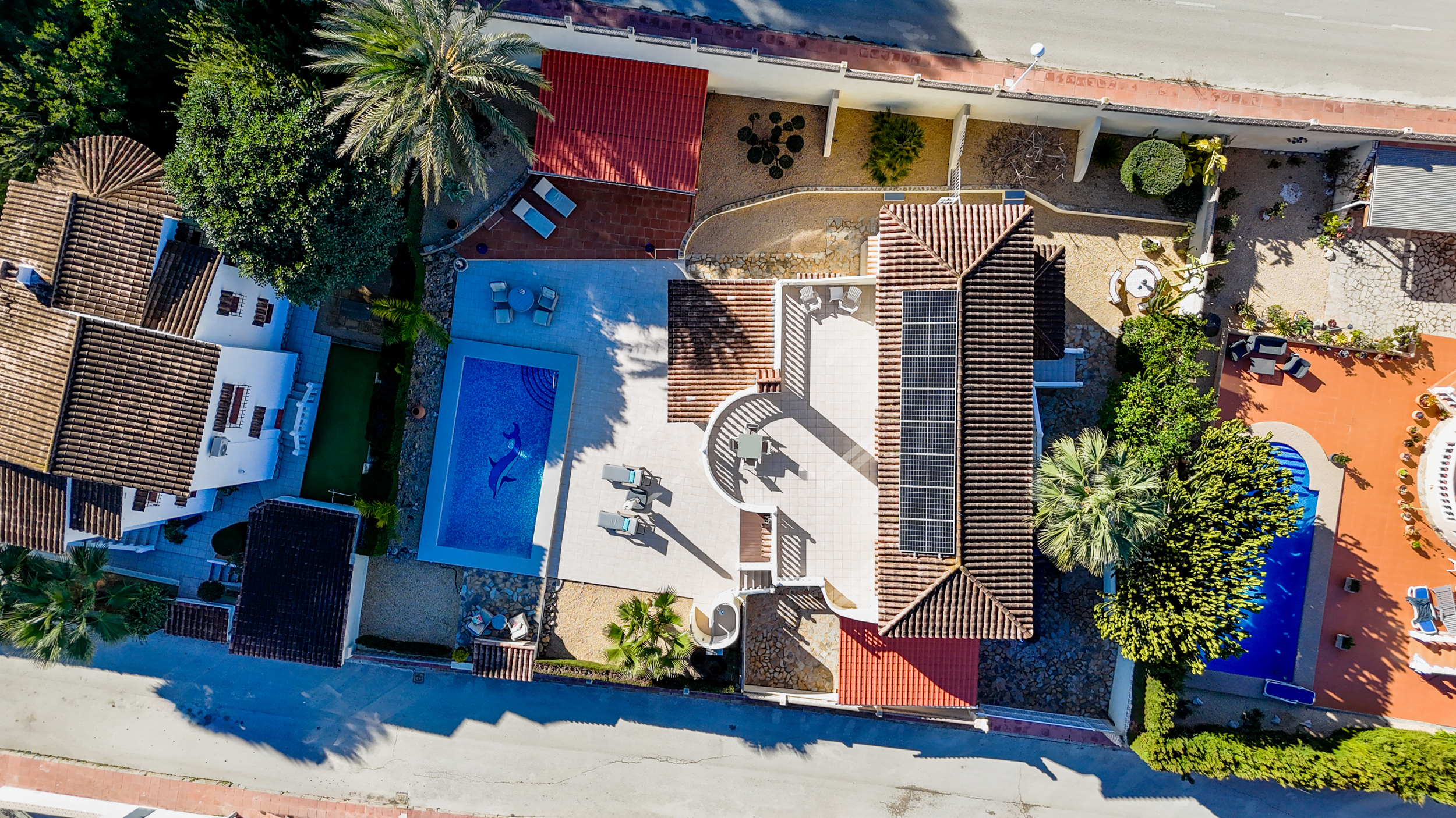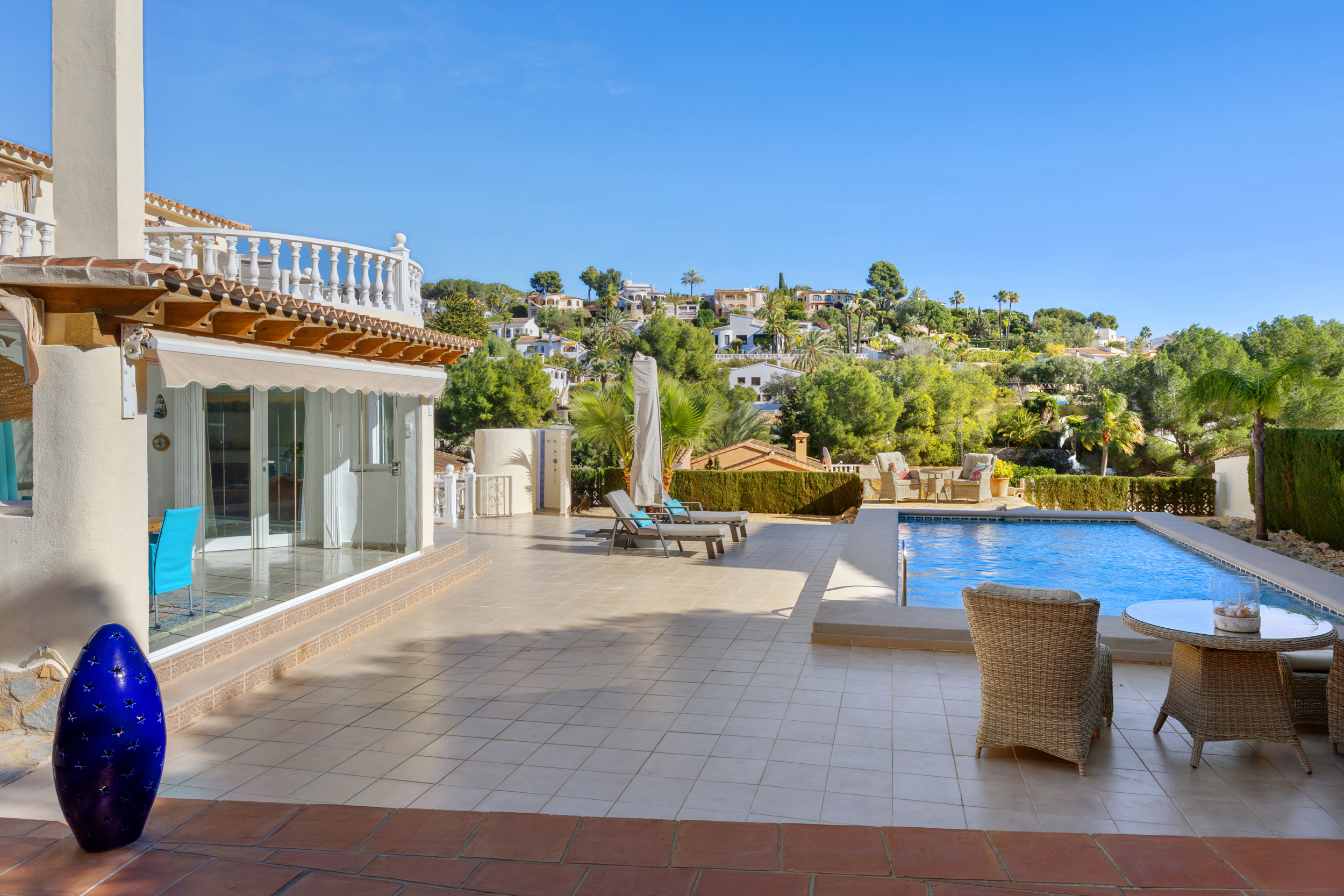 Buiten wacht het echte Mediterrane leven. Het zwembad nodigt uit tot verkoeling op warme dagen, terwijl de tuin dankzij het irrigatiesysteem en de sfeervolle buitenverlichting ook ’s avonds een fijne plek blijft. Overdekte terrassen met ventilatoren zorgen voor schaduw en comfort, zelfs tijdens de warmste maanden.