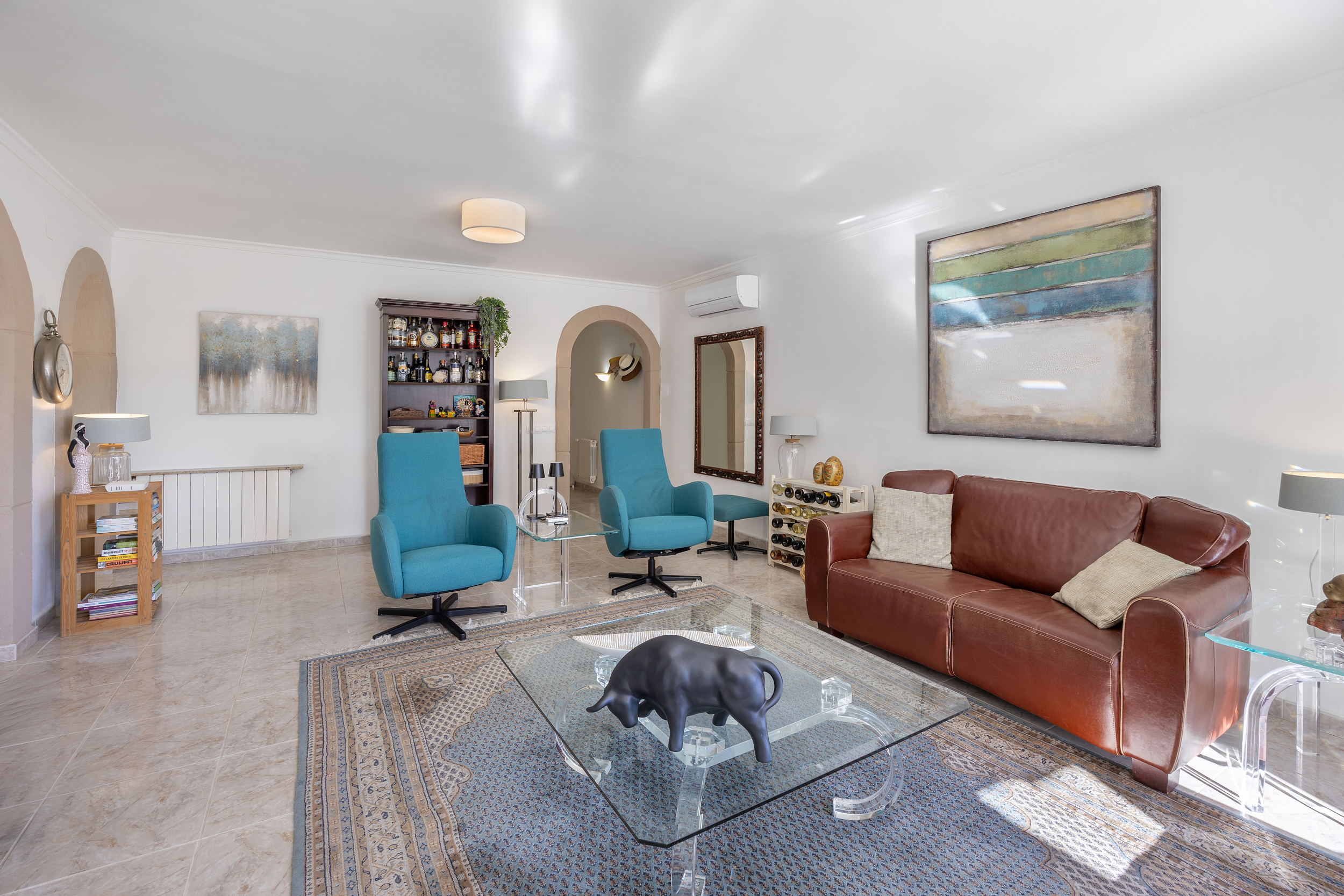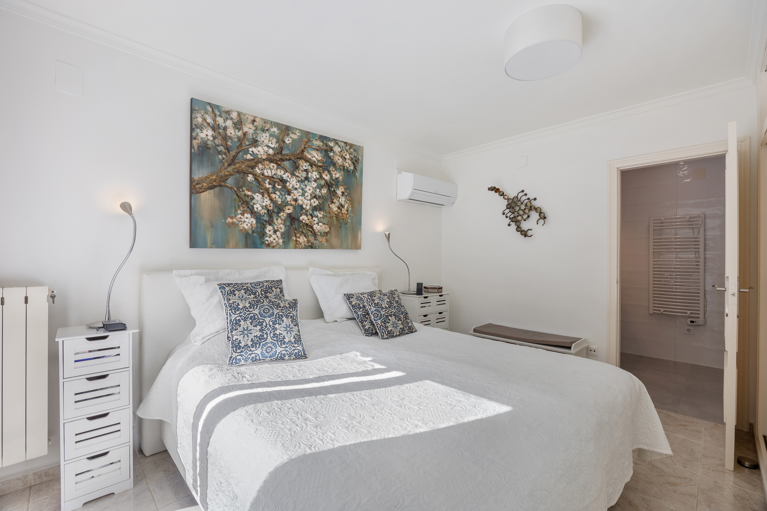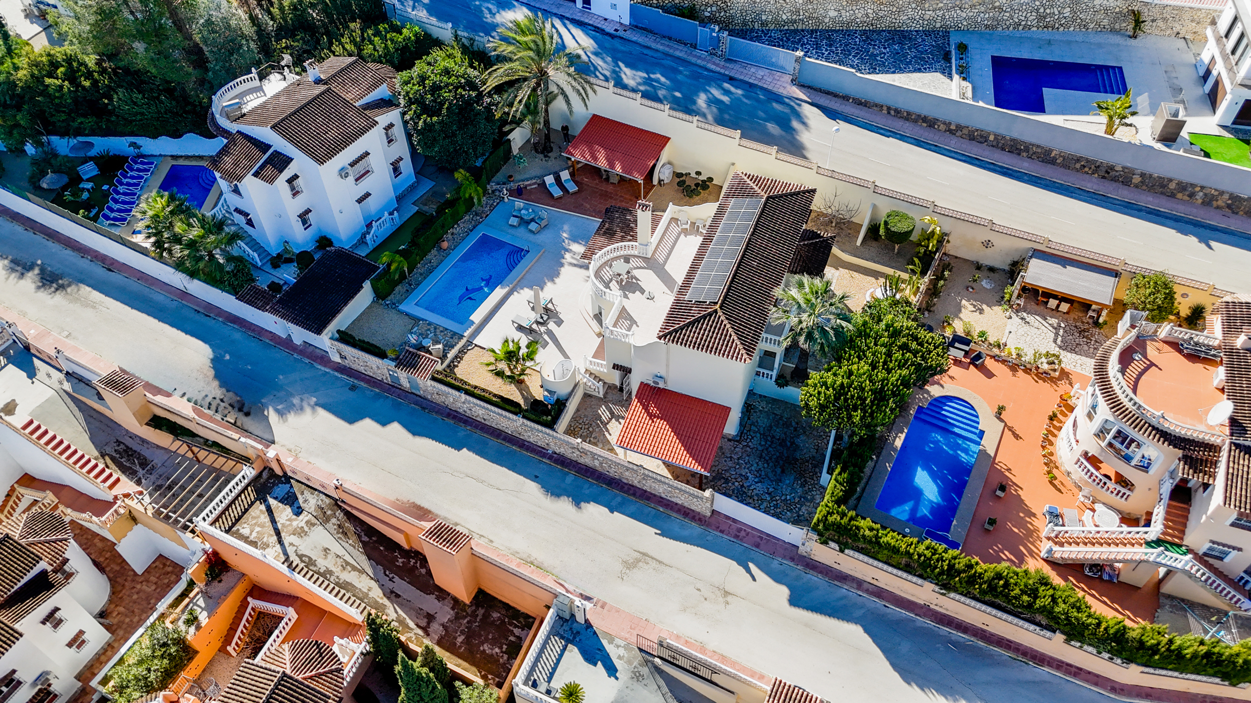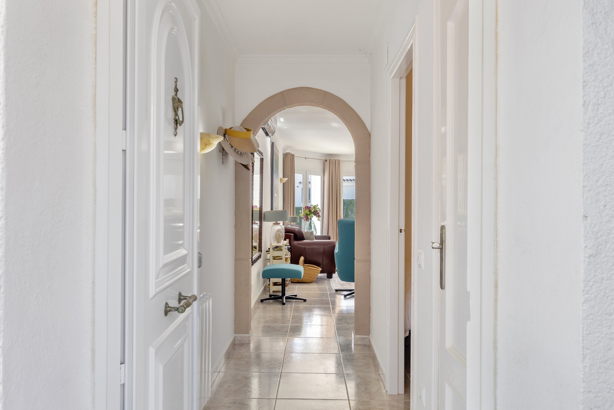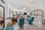 Buiten wacht het echte Mediterrane leven. Het zwembad nodigt uit tot verkoeling op warme dagen, terwijl de tuin dankzij het irrigatiesysteem en de sfeervolle buitenverlichting ook ’s avonds een fijne plek blijft. Overdekte terrassen met ventilatoren zorgen voor schaduw en comfort, zelfs tijdens de warmste maanden.